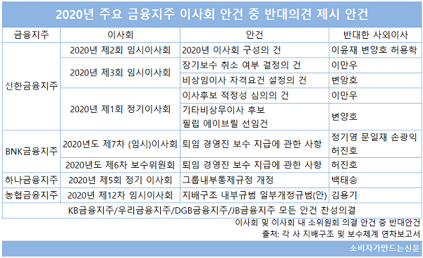 이에 비해 신한금융지주는 지난해 열린 이사회 및 소위원회에서 일부 사외이사들이 총 5차례 반대 의사를 표시했고 BNK금융지주는 2차례, 농협금융지주와 하나금융지주는 각 1차례 안건에 대해 반대 의사가 있었다.