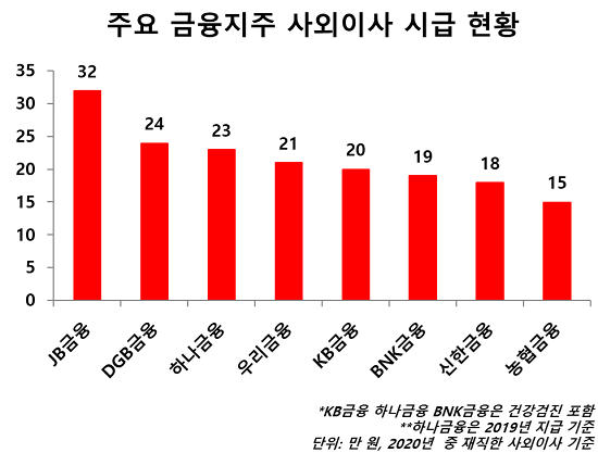 평균보수가 가장 낮은 곳은 DGB금융지주였는데 연간 5276만 원으로 보수가 가장 많았던 KB금융지주의 53% 수준에 그쳤다. JB금융지주(6177만 원), 하나금융지주(6779만 원) 등도 사외이사 평균보수가 상대적으로 적었다.