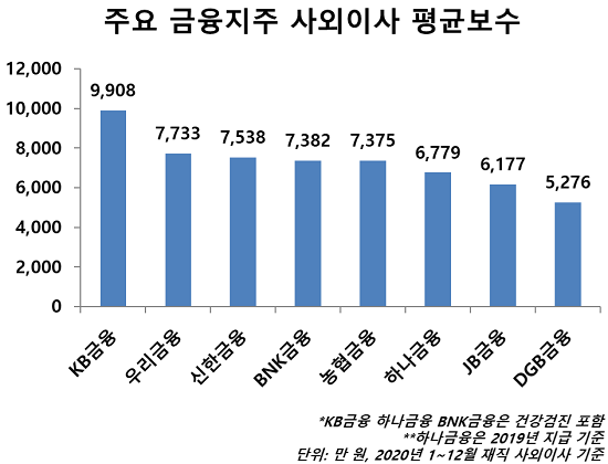 지난해 1월부터 12월까지 국내 금융지주사 8곳에서 활동한 사외이사 44명을 기준으로 연간 평균보수를 살펴본 결과, KB금융지주가 사외이사 5명에게 평균 9908만 원을 지급해 8개 금융지주사 중에서 최고액을 기록했다.