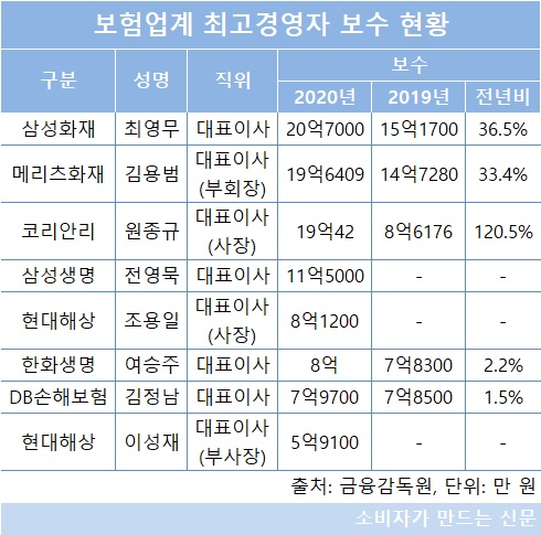 한편 지난해 3월 대표이사로 선임된 한화손해보험 강성수 대표와 흥국화재 권중원 대표 등의 연간 보수는 5억 원을 넘지 않아 사업보고서 공시 대상에서 제외됐다.