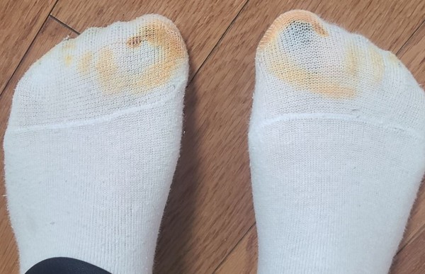 매장에 항의하자 “천연염색한 제품이라 물빠짐은 어쩔 수 없다. 다른 고객들도 오래 신다 보면 괜찮아진다고 하더라. 가능하면 어두운색 양말을 신으실 수밖에 없을 것 같다"며 고 말했다.