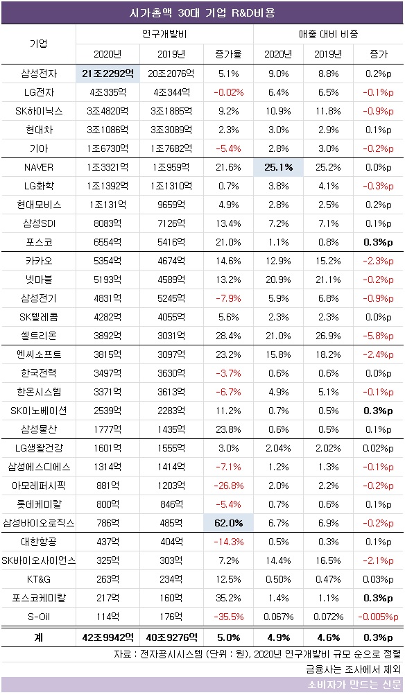 연구개발비는 삼성전자가 21조2292억 원으로 가장 많다. 삼성전자는 2019년부터 2년 연속 20조 원 이상의 연구비를 집행하고 있다. 삼성전자의 연구개발비는 지난 2017년(16조8000억 원)부터 4년 연속 매년 사상 최대 기록을 갱신하고 있다.
