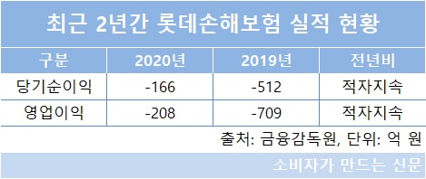 롯데손보는 지난 2019년 당기순손실 512억 원에 이어 지난해에도 당기순손실 166억 원으로 2년 연속 적자를 기록 중이다. 영업손실 역시 208억 원으로 전년 영업손실 709억 원 보다 적자폭은 줄었지만 여전히 부진을 면치 못하고 있다.