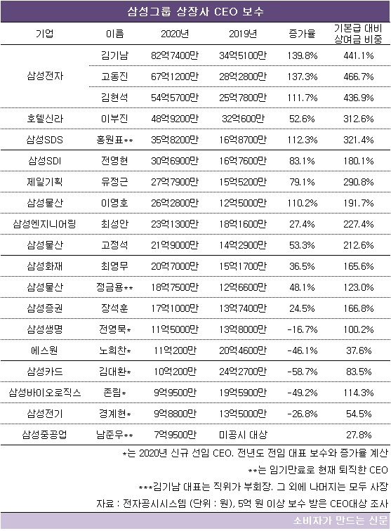 삼성 관계자는 “회사마다 규모와 매출이 다르고 CEO 개인별로 각각 보수가 책정된다”며 “임원처우규정에 따라 이사회 결의 후 직급 등을 고려해 기본급이 정해지는 식”이라고 말했다.