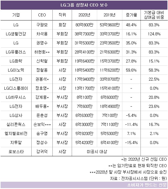 LG 관계자는 “CEO 직위별 기본급은 이사회 결의를 거치는 임원처우규정에 따르고, 회사 규모와 사업의 복잡성 등에 따라 최종 결정 된다”고 말했다.
