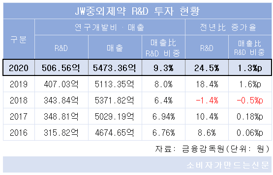 회사의 지난해 연구개발비는 506억5600만 원으로 전년에 비해 24.5% 늘었다. 매출 대비 연구개발 비율은 9.3%이다. 회사는 2021년도 연구개발 비용을 매출 대비 10%까지 끌어올릴 계획이다.