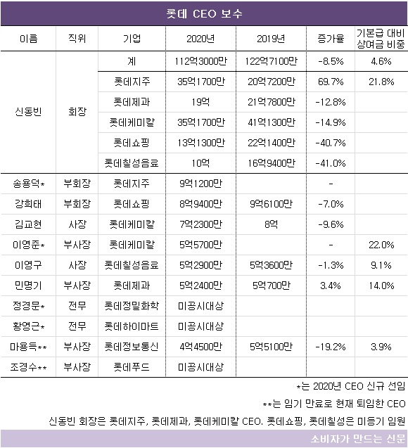 신동빈 회장은 롯데지주, 롯데제과, 롯데케미칼 대표이사와 롯데쇼핑, 롯데칠성음료 미등기임원을 맡으며 112억3000만 원의 보수를 받았다.
