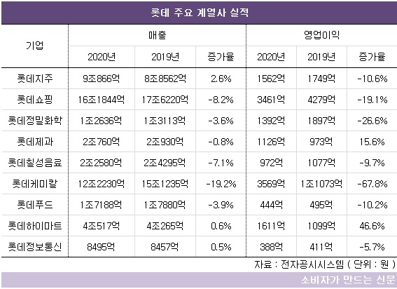 실적을 공시하는 상장사 9곳 중 영업이익이 증가한 곳은 롯데제과와 롯데하이마트 두 곳에 불과하다.