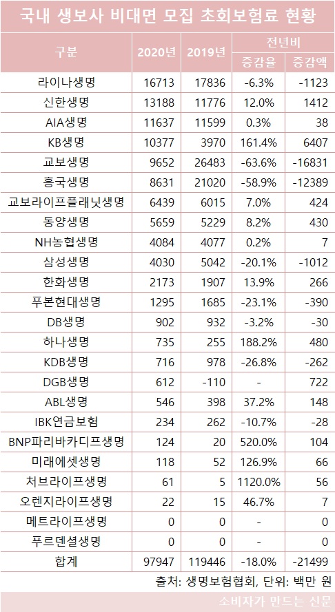 같은 기간 TM(텔레마케팅)과 CM(사이버마케팅)을 합친 비대면 모집 초회보험료는 1194억 원에서 979억 원으로 18% 감소했다.