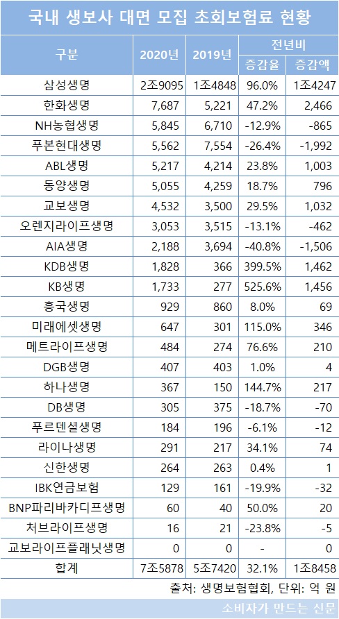 대면모집 초회보험료가 5000억 원 이상인 생보사 6곳 가운데 삼성생명의 증가율이 96%로 가장 높았고, 한화생명(대표 여승주)이 47.2%로 그 뒤를 이었다. NH농협생명(대표 김인태)과 푸본현대생명(대표 이재원)은 두 자릿수 비율로 감소했다.
