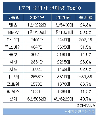 가장 많이 팔린 차는 단연 벤츠다. 벤츠는 1분기에만 1만9222대가 팔리며 2020년보다 3822대(24.8%)가 더 팔리는 저력을 과시했다.