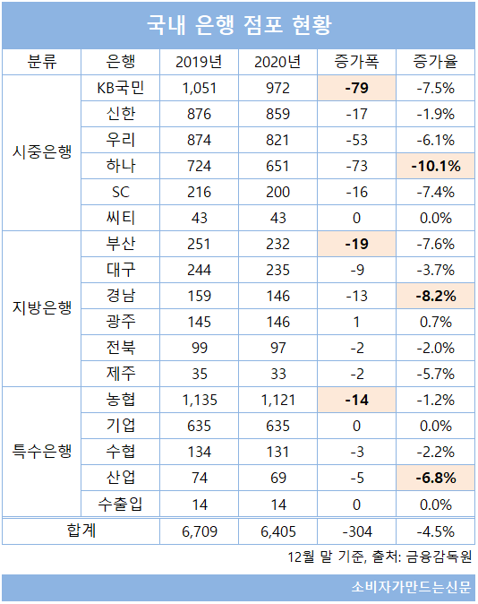 금융감독원에 따르면 지난해 말 기준 국내 은행 점포 수는 6405개로 전년 대비 304개 줄었다. 특히 2017년 312개 감소한 이후 최대 감소치로 폐쇄점포는 334개, 신설점포는 30개에 불과했다.