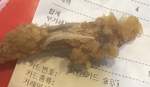 김 씨는 "닭 털에 묻은 닭똥이 상상돼 너무 괴롭다. 원료 관리를 어떻게 하기에 닭 털이 그대로 치킨과 함께 튀겨진 건지 이해할 수 없다"며 불쾌해했다.