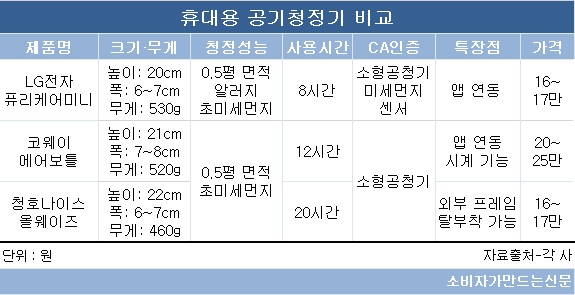 휴대용 공기청정기를 판매하는 LG전자와 코웨이, 청호나이스 등 3사 제품을 비교한 결과 공기청정면적은 3사가 비슷했으며 사용시간과 무게 등 편의성은 청호나이스 제품이 앞섰다.