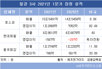 포스코(회장 최정우)는 1분기 영업이익이 전년 동기에 비해 80% 이상 증가하고, 현대제철(대표 안동일)은 지난해 1분기 영업적자의 충격을 딛고 흑자로 전환하리라는 예상이다. 동국제강(대표 장세욱·김연극)은 매출과 영업이익이 두 자릿수 비율로 증가할 것으로 분석된다.
