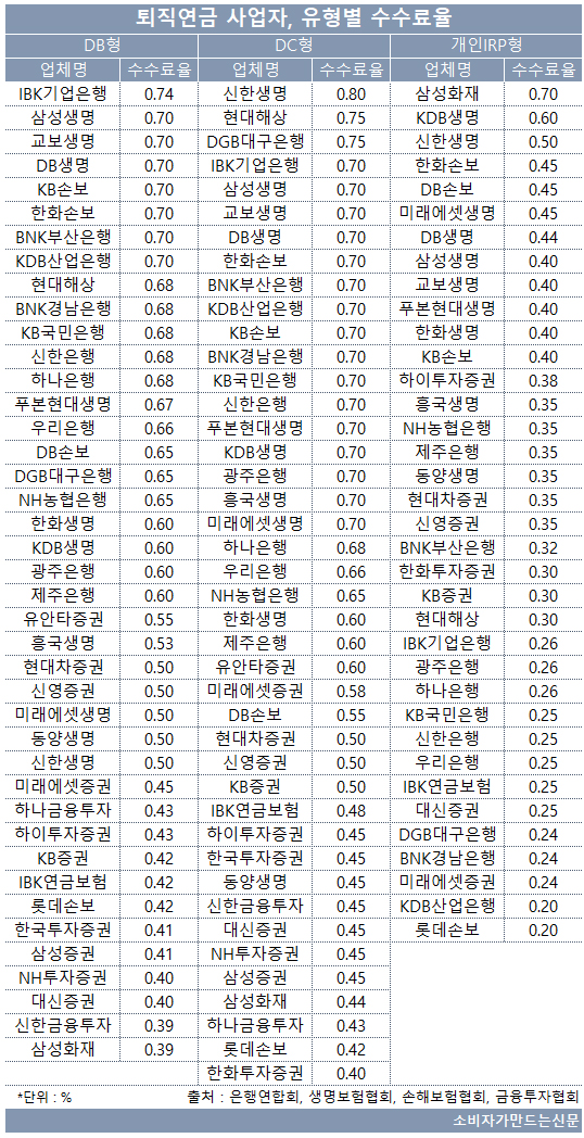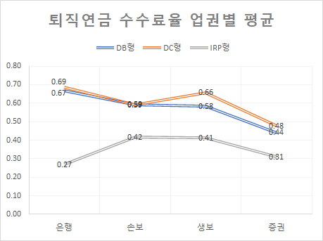 11일 퇴직연금을 운용 중인 42개 금융사의 유형별 수수료율을 조사한 결과 DB형 기준 은행 평균 수수료율이 0.67%로 높고 증권사가 0.44%로 낮았다. 손해보험사(0.59%), 생명보험사(0.58%)는 중간 수준이었다.