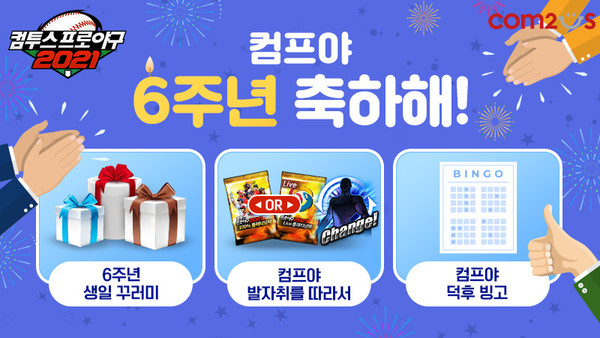먼저 오는 30일까지 게임에 접속하는 모든 유저에게 각종 아이템들로 구성된 '6주년 기념 생일 꾸러미'가 선물로 지급된다. 특히 패키지 구성품에 속한 '시그니처 선수팩'은 KBO리그에서 뛰어난 활약을 펼쳤던 전현역 선수들의 친필 싸인이 수록된 선수 카드로 컴프야2021 유저들이 가장 선호하는 아이템 중 하나로 손꼽힌다.