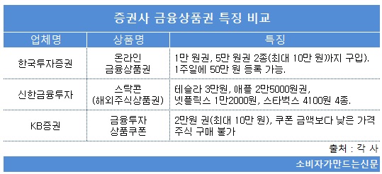 KB증권은 3월29일 국내 주식을 매수할 수 있는 ‘금융투자 상품쿠폰’을 출시했다. 온라인쇼핑몰에서 2만 원권 상품권을 구입하고 난 뒤 KB증권 MTS에서 일련번호를 등록하면 상품권 액수만큼 충전이 되고 이를 활용해 주식을 매수할 수 있다.