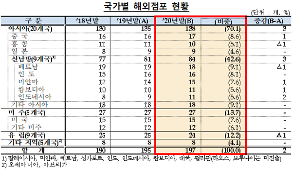 국가별로는 베트남(18개), 중국(17개), 인도(16개), 미얀마(15개) 등 아시아지역 점포가 138개로 전체의 70.1%를 차지했고 미주 27개(13.7%), 유럽 24개(12.2%)지역에서 해외점포를 운영하고 있었다.