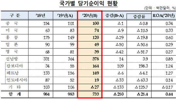 수익성도 악화됐다. 지난해 해외점포 당기순이익은 전년 대비 25.4% 감소한 7억3300만달러로 대손비용 급증에 따라 수익성에 영향을 미쳤다.
