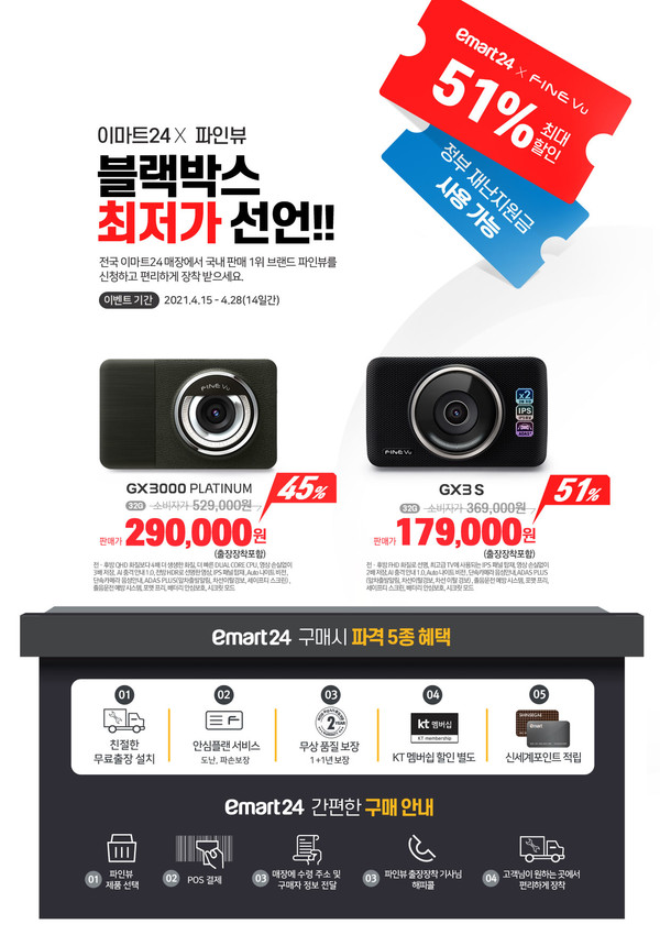 파인뷰 블랙박스 2종(GX3000_PLATINUM / GX3S)은 온라인에서 각 52만9000원 / 36만9000원에 판매중인 상품으로, 이마트24는 출장설치까지 포함해 각 45% / 51% 할인된 290000원 / 17만9000원에 판매한다. 이마트24는 파인뷰와 협의를 통해 온·오프라인 최저가를 목표로 가격을 설정했다.