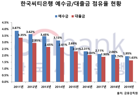 대표적인 개인영업 지표인 예수금/대출금 점유율에서도 1~2%대 점유율을 기록하며 다른 국내 시중은행은 물론 외국계은행인 한국SC은행(행장 박종복)보다 수 년전부터 점유율이 뒤쳐지고 있다. 지난 2019년 말 기준 예수금 점유율은 1.95%, 대출금 점유율은 1.63%로 2% 아래로 떨어졌다.