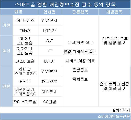 가전·통신업체 스마트홈 앱은 가전제품, IoT디바이스를 통해 명령을 입력하고 건설업체는 홈 네트워크를 통해 서비스를 제공하다 보니 수집하는 세부 정보에는 차이가 있다.