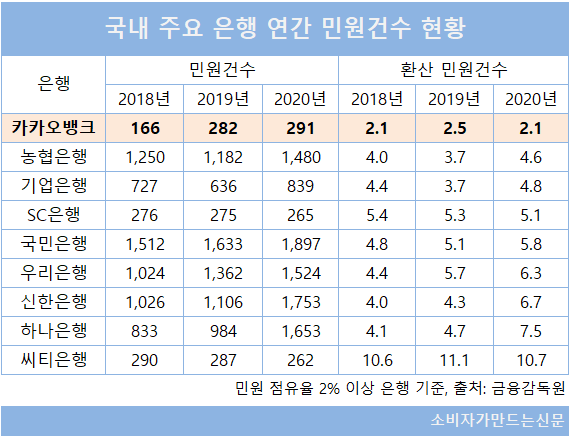 전체 민원건수 기준으로도 카카오뱅크는 2018년 166건에서 이듬해 282건으로 급증했지만 지난해 291건으로 증가세가 둔화됐다. 전체 은행권에서는 한국씨티은행(262건)을 제외하고는 민원이 가장 적다.
