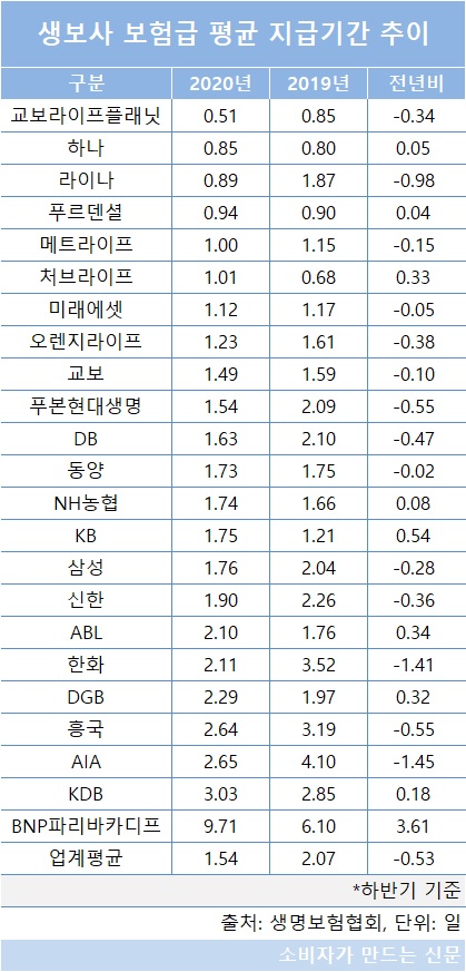 생명보험협회 자료에 따르면 지난해 하반기 생명보험사의 평균 보험금 지급기간은 1.54일로 집계됐다. 전년도 하반기 2.07일에 비해 0.53일 단축됐다.