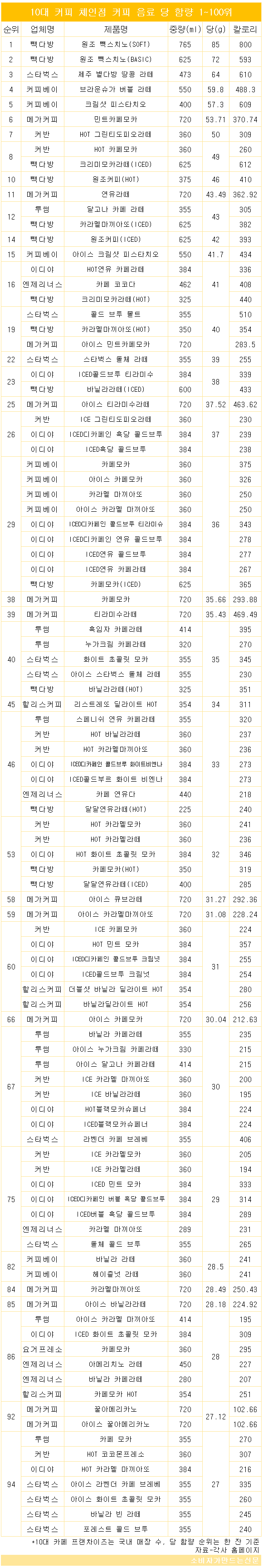 당 함량 상위 10위권에는 빽다방 제품이 4개로 가장 많았다. 이어 커피베이와 커피에반하다 제품은 2개, 스타벅스와 메가커피 제품은 각각 1개씩 포함됐다.