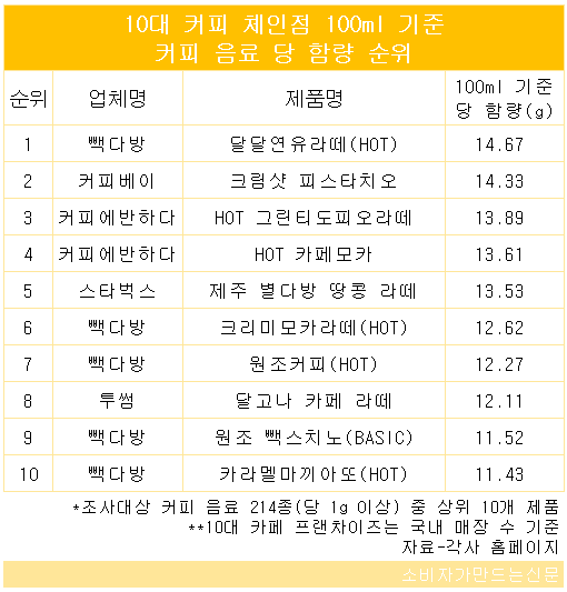 이어 커피베이의 '크림샷 피스타치오'(14.3g), 커피에반하다 'HOT 그린티도피오라떼'(13.9g)와 'HOT카페모카'(13.6g), 스타벅스 '제주 별다방 땅콩 라떼'(13.5g) 순으로 높았다.