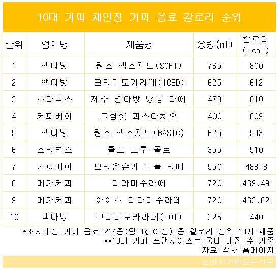 스타벅스의 '콜드 브루 몰트'와 빽다방의 '크리미모카라떼(HOT)'는 용량이 300ml대로 적은데도 칼로리 상위 10위권에 이름을 올렸다.