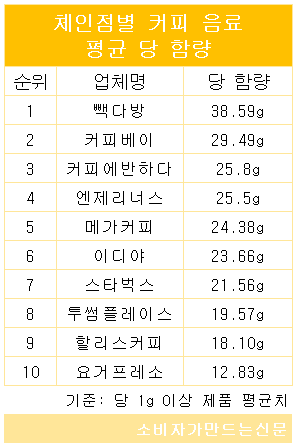 23일 소비자가만드는신문이 전국 매장 수 기준 10대 프랜차이즈 커피전문점에서 판매하는 당 함량 1g 이상의 커피 음료 214종을 각사 홈페이지 영양성분표를 기준으로 조사한 결과 한 잔당 평균 23.5g의 당이 함유된 것으로 나타났다. 100ml 기준으로는 5.9g이었다.