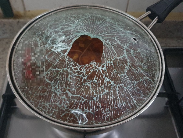 소리에 놀라 깨보니 냄비뚜껑 손잡이가 날아가고 유리 파편도 튀어 크게 다칠 뻔했다고.