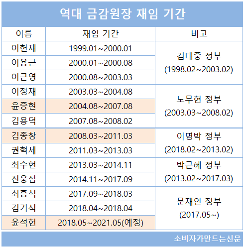 금감원 분리 이후 시기만 살펴보더라도 권혁세 전 원장은 박근혜 정부가 출범한 2013년 3월 사의를 표명했고 진웅섭 전 원장 역시 문재인 정부 출범 이후 금감원장직에서 내려왔다. 다만 진 전 원장은 2년 10개월 간 재직하며 임기 대부분을 채웠다.