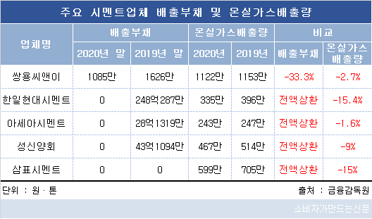한일현대시멘트(대표 허기수·전근식), 아세아시멘트(대표 이훈범·김웅종·임경태), 성신양회(대표 김영준·김상규), 삼표시멘트(대표 이종석)는 지난해말로 온실가스 배출부채를 전액 상환했고 쌍용씨앤이(대표 홍사승·이현준)도 소액만 남은 상황이다. 배출부채는 탄소배출 할당량을 초과해 온실가스를 배출하는 기업이 시장에서 탄소배출권을 구매하는 비용이다.