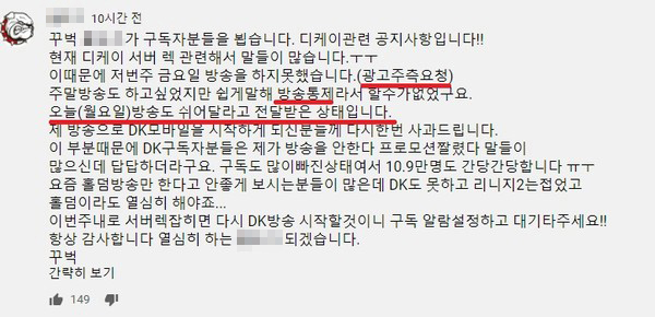 ▲​진영전 방송을 종료한 유튜브 BJ는 광고주인 엔트런스로부터 방송을 쉬어달라는 요청을 받았다