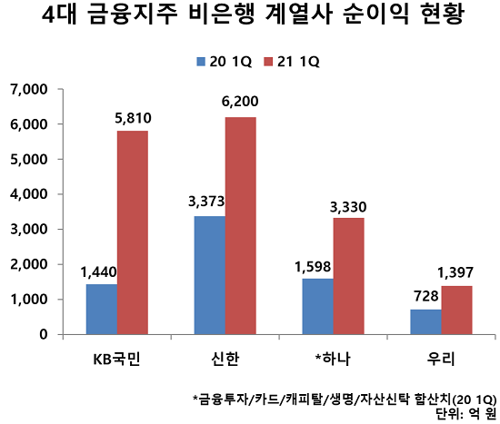 그러나 비은행 계열사 수익으로 살펴보면 KB금융은 지난해 1분기 1440억 원에서 올해 1분기 5810억 원으로 4배 이상 급등했고 신한금융 역시 같은 기간 3373억 원에서 6200억 원으로 2배 가까이 급증했다.