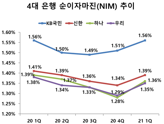 올해 1분기 은행들의 순이자마진은 KB국민은행이 1.56%로 가장 높았고 신한은행(1.39%), 하나은행(1.36%) 우리은행(1.35%) 순으로 전 분기 대비 평균 5~8bp 상승했다.