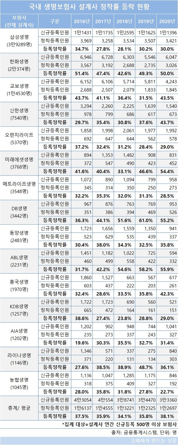 금융통계정보시스템에 따르면 지난해 설계사 신규 등록 인원이 500명 이상인 15개 생보사의 평균 설계사 정착률은 38.1%로 최근 5년 중 가장 높은 수치를 기록했다.