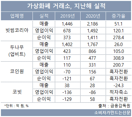국내 가상화폐 거래량이 가장 많은 두나무 ‘업비트’의 영업이익은 지난해 866억 원으로 전년 대비 105% 증가했다. 순이익 역시 477억 원으로 전년 대비 4배 넘게 급증했다. 매출은 1767억 원으로 굳건한 1위를 지키고 있던 빗썸코리아를 바짝 뒤쫓고 있다.