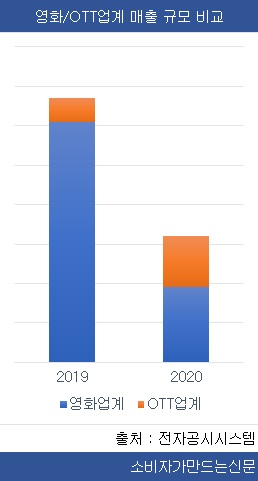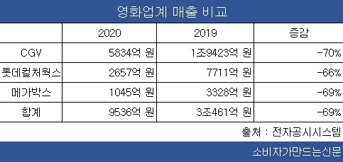 2020년 CJ CGV(대표 허민회, 이하 CGV)는 -70%의 매출 하락을 보였고 롯데컬처웍스(대표 기원규, 롯데시네마)가 -66%, 메가박스(대표 김진선)는 -69%를 기록했다.