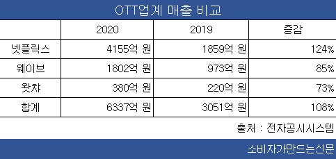 124%의 초 고성장으로 업계를 이끌고 있는 넷플릭스(Netflix)서비시스코리아(대표 레지날드숀톰슨, 이하 넷플릭스)가 4155억 원, 2위 콘텐츠웨이브(대표 이태현, 이하 웨이브)가 1802억 원, 왓챠(대표 박태훈)는 380억 원을 기록했다.