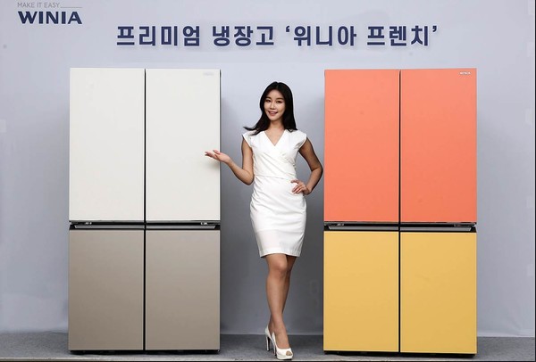 위니아 프렌치 냉장고는 최근 컬러 가전 트렌드를 반영해 프리미엄 사틴 글라스와 유광 글라스 등을 적용해 다양한 인테리어에 대응할 수 있도록 했다.