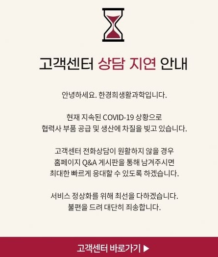 취재가 진행된 이후 한경희생활과학 사이트에는 코로나19로 고객센터 상담이 지연되고 있다는 팝업이 띄워진 상태다.