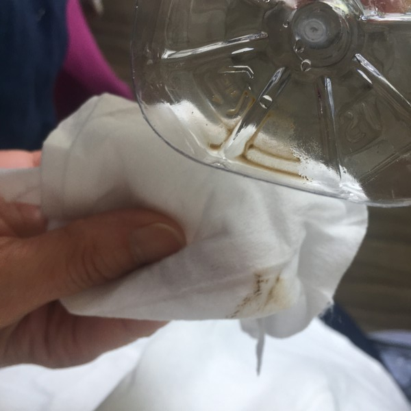 처음에는 겉면에 뭔가 묻은 줄 알았으나 페트병을 잘라 닦아내자 이물질이 묻어났다. 아직 개봉하지 않은 다른 생수 페트병에도 마찬가지로 바닥면에 흙인지 분(糞)인지 모를 이물이 묻어있었다.