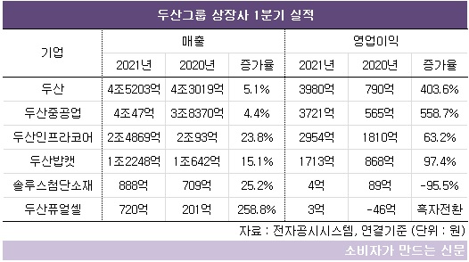 그룹 지주사인 (주)두산(대표 박정원·김민철·곽상철)은 올 1분기에만 지난 한 해 실적보다 1.5배 많은 영업이익을 냈다.