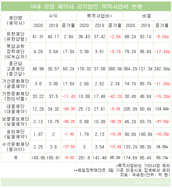 4일 국세청에 따르면 국내 10대 제약사 중 공익법인 9곳의 지난해 사업 수익은 150억 원으로 전년 대비 9.5% 가량 줄었고 공익 활동을 위한 목적사업비는 262억 원으로 85% 증가한 것으로 집계됐다.