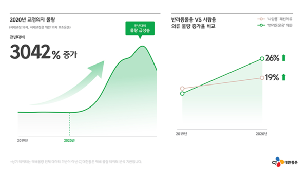 집콕생활로 반려동물과 함께하는 시간이 길어지면서 반려동물과 관련된 택배 물량도 늘어난 것으로 나타났다. 반려동물과 관련된 물품들은 간식사료 44%, 영양제 38%, 장난감 36% 등 전반적인 상승세를 보였다. 반려동물 패션에 대한 관심도 높아지면서, 사람용 패션의류 물량이 19% 증가한 반면 반려동물 의류는 26% 상승했다.