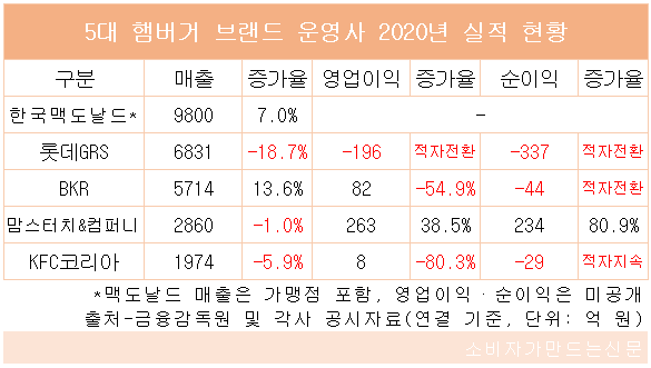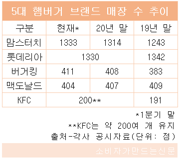 3일 금융감독원 전자공시시스템과 각사 공시자료에 따르면 맘스터치, 롯데리아, 버거킹, 맥도날드, KFC 등 5대 햄버거 브랜드 운영사들의 지난해 매출은 총 2조7180억 원 가량으로 전년에 비해 약 1% 가량 줄었다.
